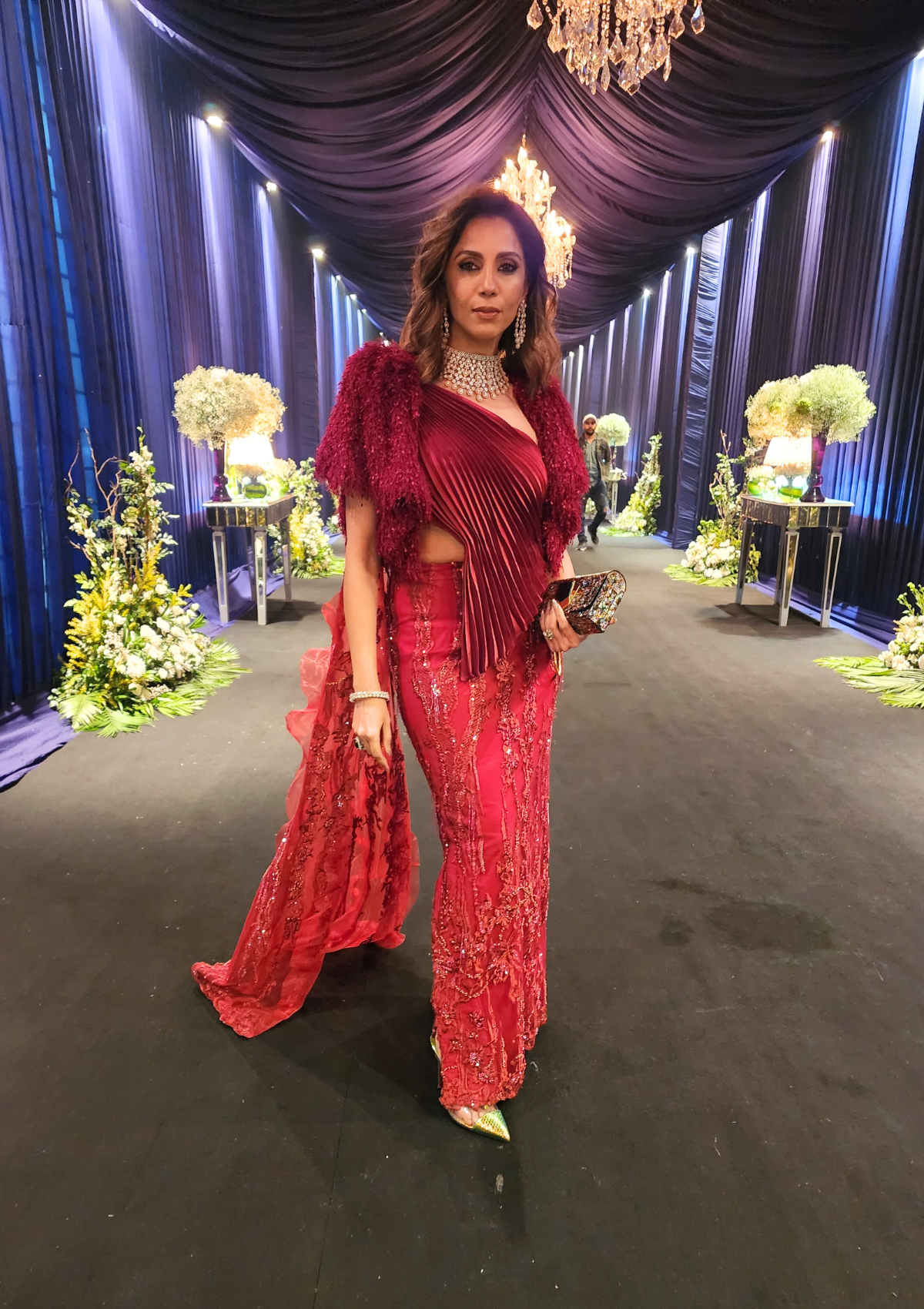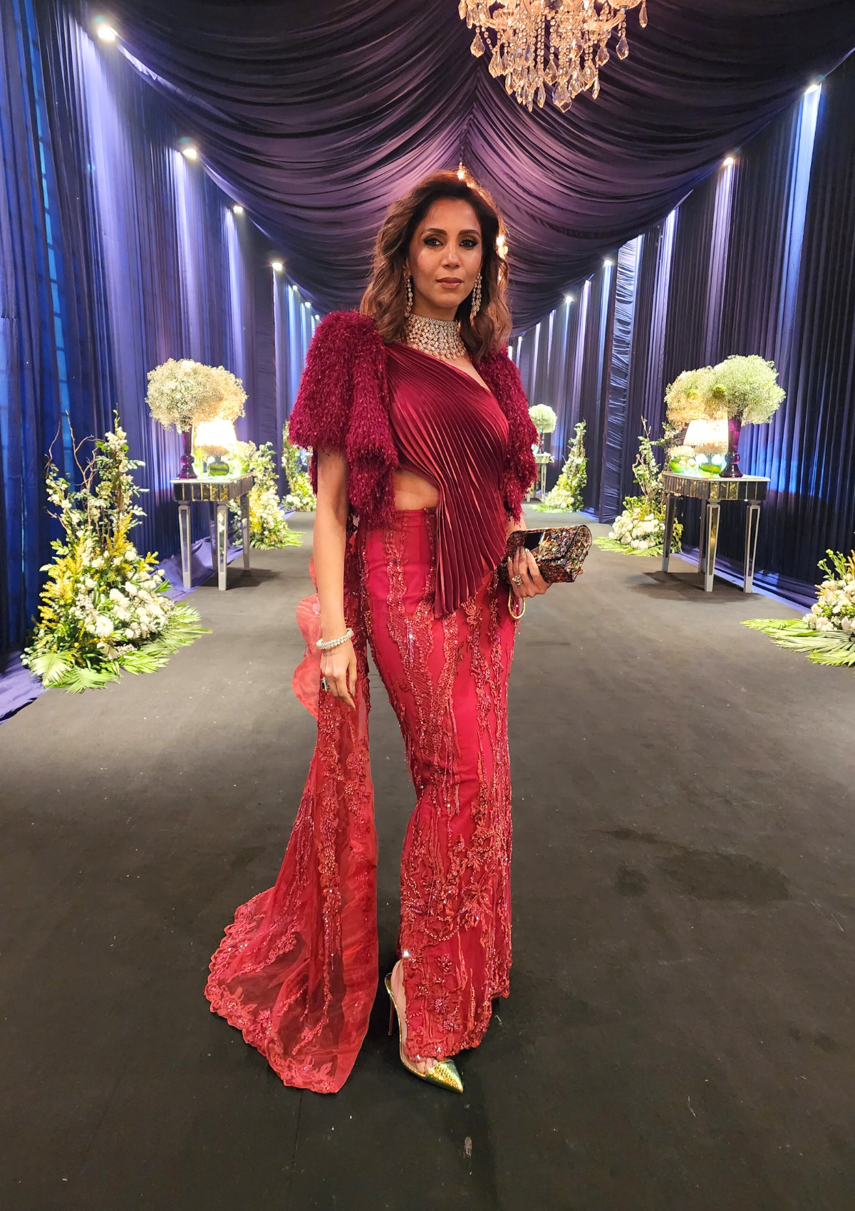 A mesmerizing ensemble blending elegance and allure. With a pleated top exuding sophistication and a sequin skirt adding sparkle, it's a captivating choice for any special occasion. Complete with a graceful trail, this ensemble ensures you leave a lasting impression wherever you go.