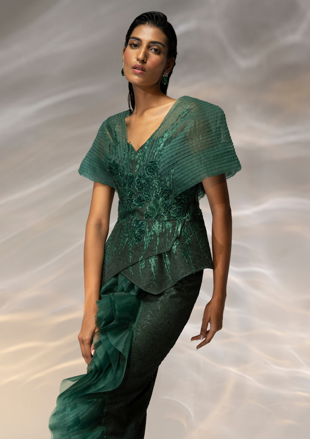 A captivating ensemble that effortlessly merges sophistication with a touch of whimsy. The rich, dark green hue of the top exudes an aura of refinement, while the long slit frill skirt adds a playful yet elegant flair. The frills cascade gracefully with each movement, creating a mesmerising visual effect. This dress embodies timeless charm and modern allure, making it perfect for any special occasion where style and grace are paramount.