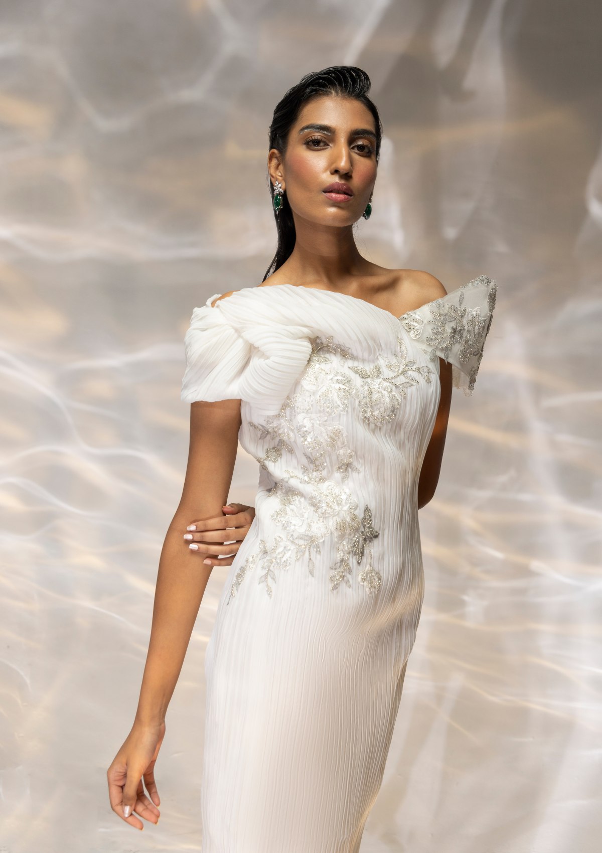 The "Wispy Silverlight" dress is a dream in airy organza. Delicate silver threads shimmer across the off-the-shoulder bodice, creating a celestial look. The lightweight fabric cascades down to a flattering knee-length skirt, perfect for twirling under the summer night sky.