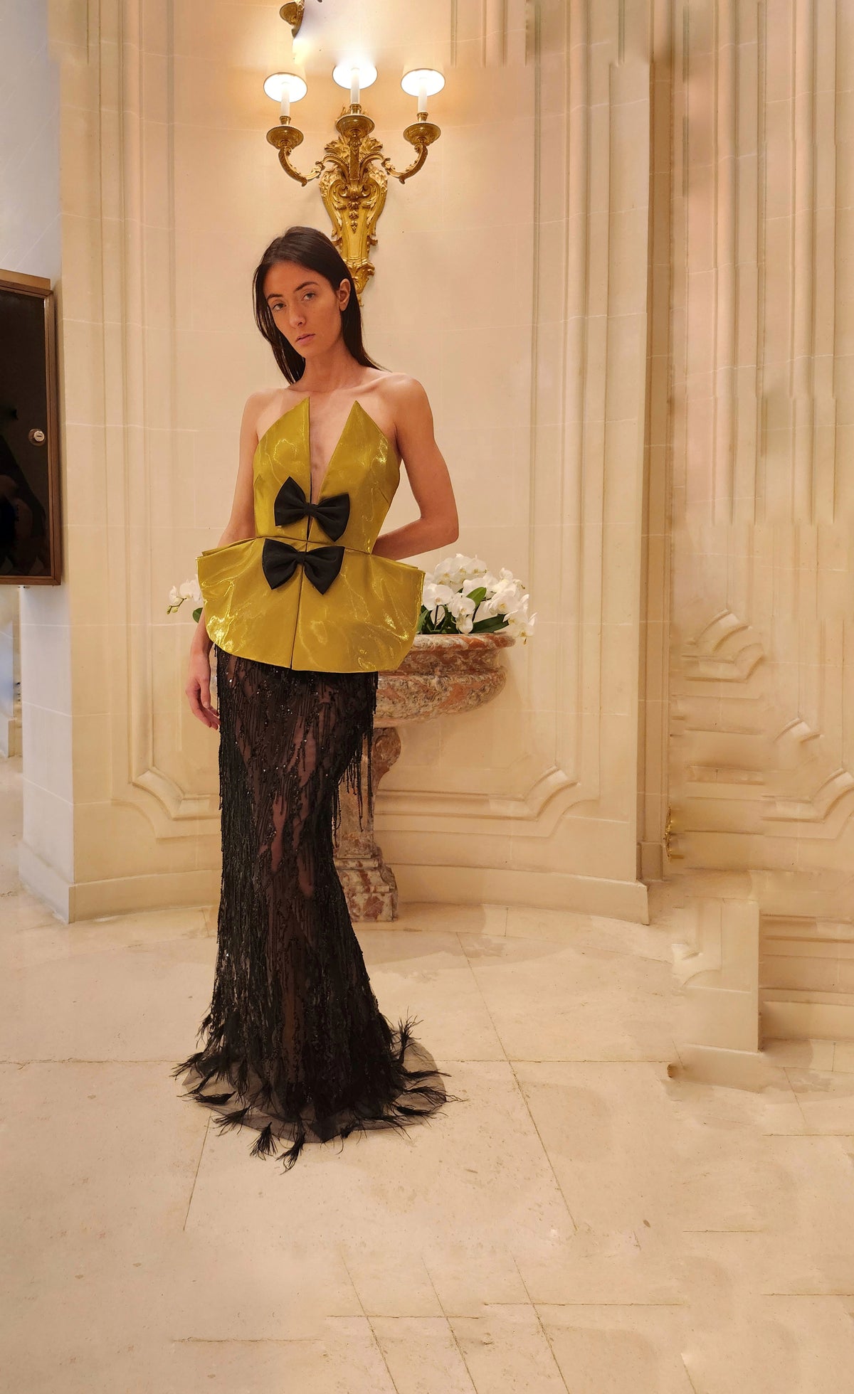 A captivating creation that exudes sophistication and grace. The structured olive top, designed with a modern silhouette, draws attention with its sharp lines and statement bows. Complementing the top is a luxurious black tasseled skirt, flowing with intricate texture and movement, embodying elegance and charm. Perfect for occasions where timeless style meets contemporary allure.
