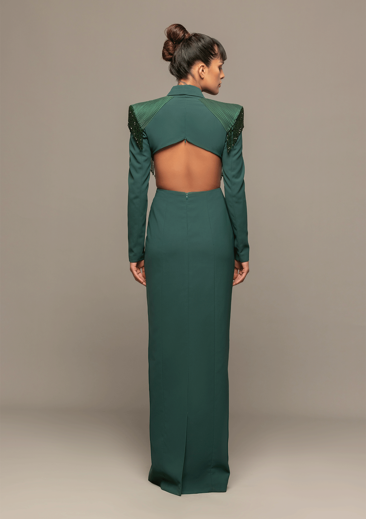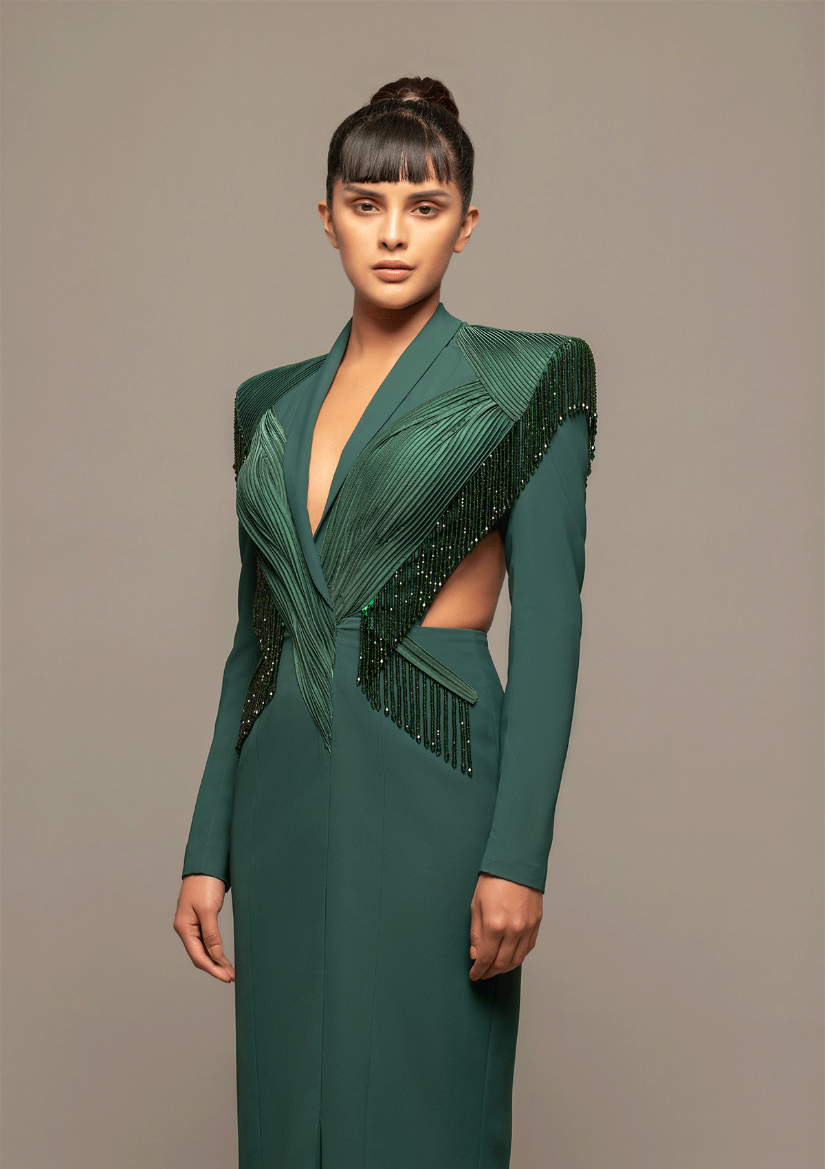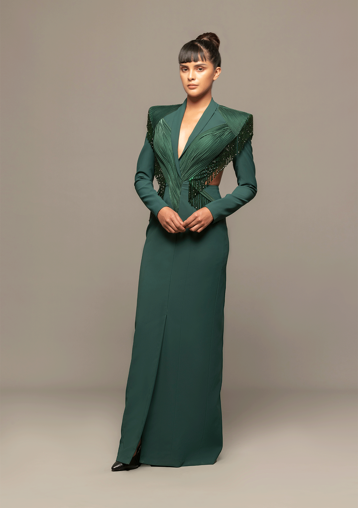 Introducing "Power Shoulder gown" meticulously crafted to exude authority and elegance. This creation boasts commanding power shoulders, a gracefully structured silhouette, and an unwavering confident fit. Whether commanding the boardroom or mingling at a casual business brunch, let your presence resonate with every step, radiating the strength and grace of a woman who conquers challenges big and small.