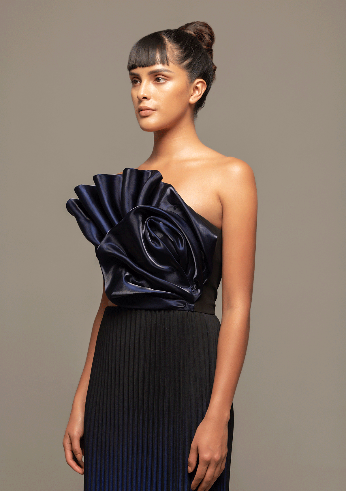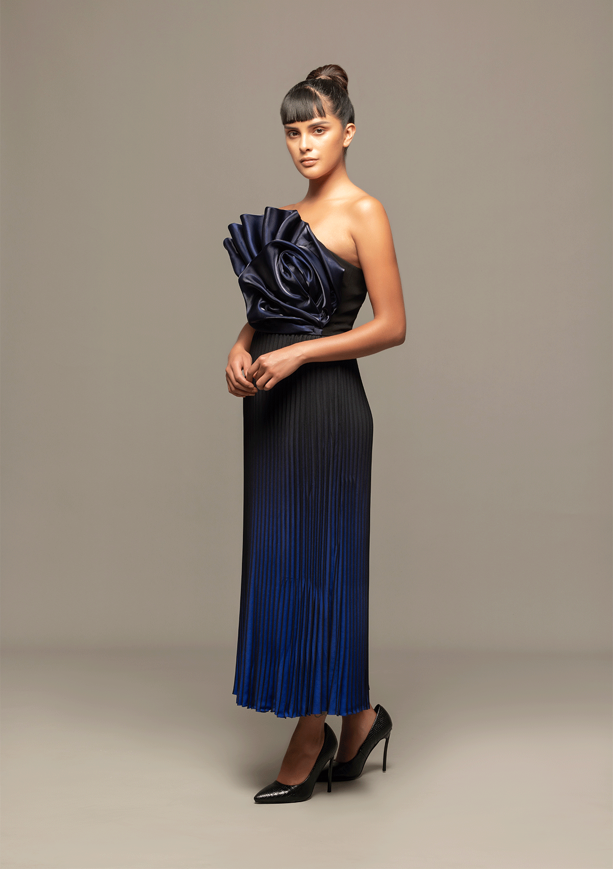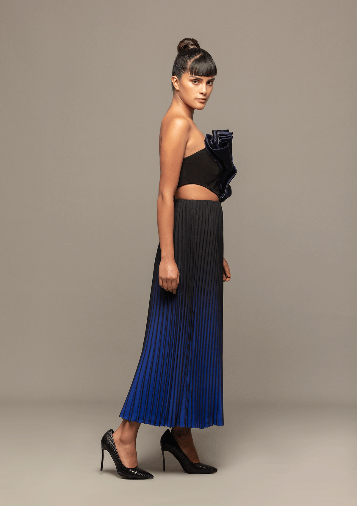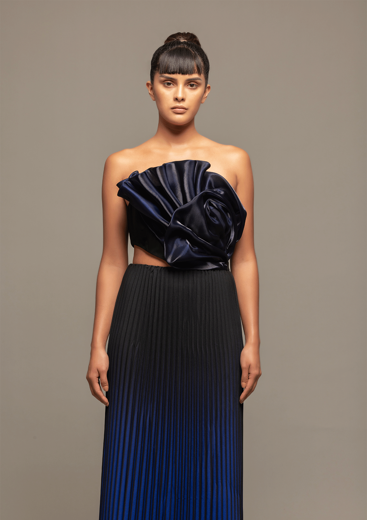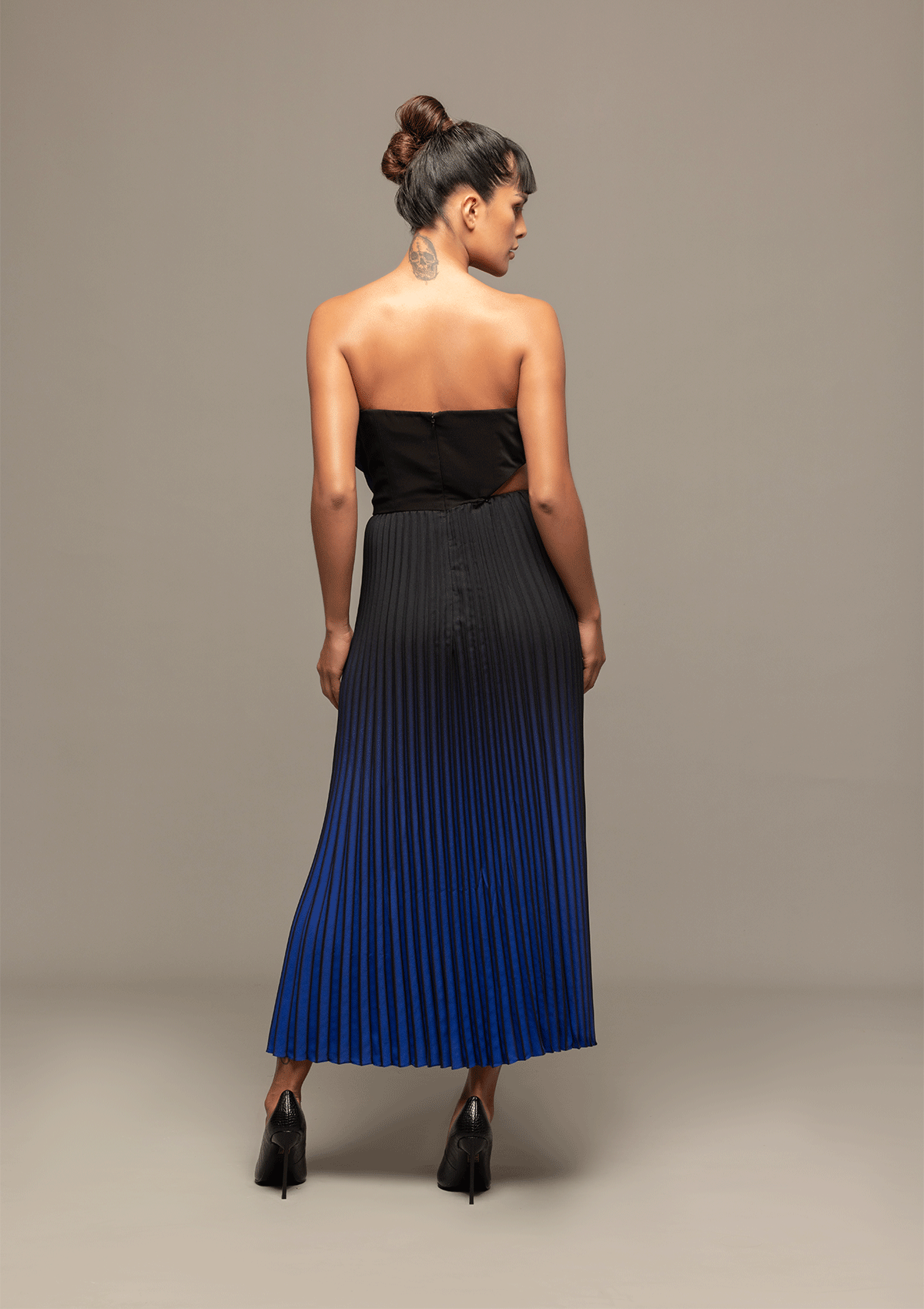 Introducing "Elegant Essence" - a manifestation of feminine strength and passion. Featuring a structured bodice paired with a pleated skirt, this ensemble unfurls the essence of power in a graceful dance. The ombre effect enhances its fluidity, adding a touch of delicate yet striking charm to every twirl.