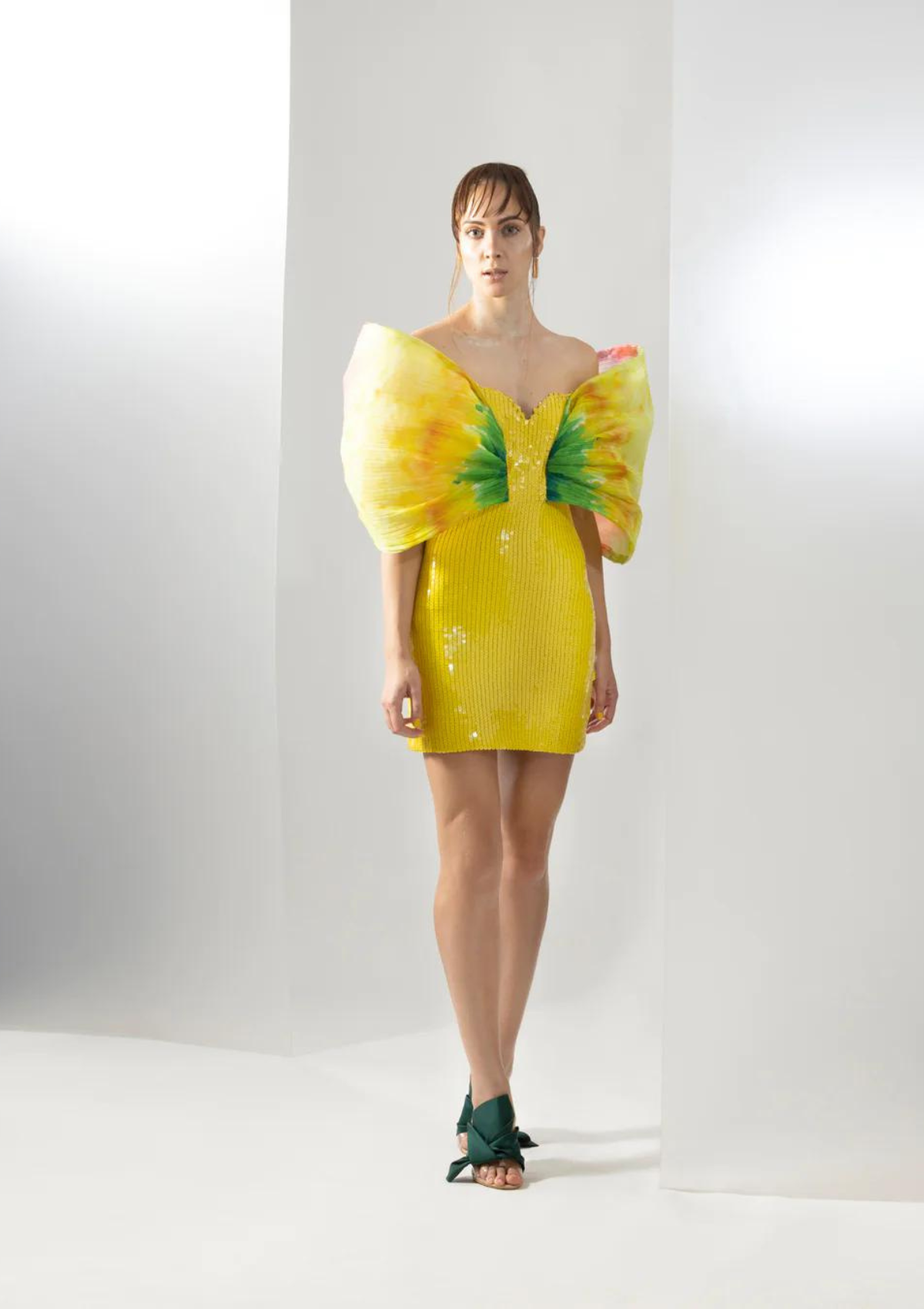 Embodying the spirit of sunshine and all things fine, this sequined dress with statement sleeves is an eyecatching piece that will catch all the light. Opt for minimal accessories to let the outfit do all the talking.